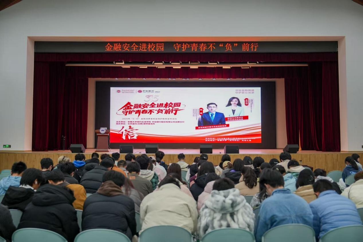 3月11日,在安徽省银行业协会指导下,中信银行合肥分行走进安徽大学龙河校区,开展“金融安全进校园、守护青春不‘负’前行”主题宣传。活动以专题讲座、趣味互动闯关等形式,面向青年学子普及理性消费、防范校园贷、个人信息保护等核心金融知识,帮助大学生提升金融素养与风险防范意识。