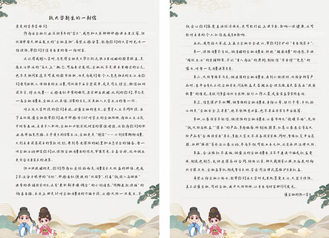 以“一封信”“一堂课”“一本通”“一视频”等为宣传载体,持续助力提升安徽省大学生金融素养,防范金融消费风险。